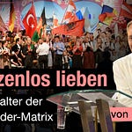 Und wir hören auf, uns in diese verdammte Spaltung reinzugeben. Die hast du in jeder politischen Szene. Links gegen rechts, gegen Mitte. Bringen wir die Liebe wieder zur Welt. Das ist der Urgedanke von jeder Religion. Das sind deshalb unsere Brüder, versteht ihr? Wer Gerechtigkeit tut, ist aus Gott. Wer Liebe übt, ist aus Gott. Und wenn er tausendmal scheitert – er ist aus Gott. Ich möchte dem Moslem zu seinem Recht verhelfen. Versteht ihr? „Um Heilsfragen gilt es sich nicht mehr zu streiten. Sagst du das damit, Ivo?“ Ich sag: Ja, richtig. Wenn doch jede Religion sowieso besser weiß, wie man in den Himmel kommt, dann lass sie doch dahinziehen. Warum soll ich, wenn ich meinem Weg zum Himmel in meinem Kopf oder in meinem Herzen habe – warum soll ich den anderen denn auf diesen Weg zwingen, wenn er sagt: „Ich weiß es besser als du. Ich finde meinen Weg zum Himmel.“ Bevor wir uns in dieser Rechtgläubigkeit weiter verirren, sag ich dir, wo die Matrix durchweht: Jetzt ist einfach mal Schluss damit! Okay?